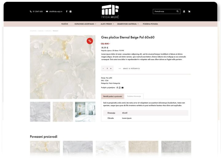 U ovom case studyju istražujemo kako smo transformirali online prisutnost klijenta kroz razvoj sofisticirane web trgovine. Frida Mijić bavi se trgovinom i maloprodajom keramičkih pločica, sanitarija, kupaonskog namještaja i građevinskog materijala. Zastarjela web stranica nije uspijevala predstaviti firmu u pravom svjetlu, niti omogućiti online kupovinu. Naš zadatak je bio izraditi platformu koja ne samo da modernizira dizajn, već i poboljšava korisničko iskustvo. Konačno rješenje rezultiralo je i olakšanim upravljanjem proizvodima te najvažnije – poticanjem online prodaje.