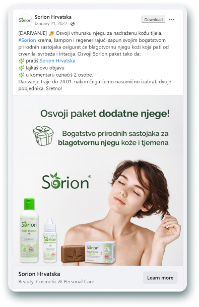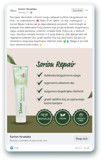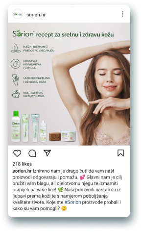 Uz navedene aktivnosti, spomenuli bismo suradnju organiziranu s online platformom Ženski recenziraj. Sorion kremu poslali smo na recenziranje i bili smo uvjereni da će dati dobre rezultate – što se i dogodilo! Glas o Sorion djelotvornosti dodatno je odjeknuo i proširio zajednicu zadovoljnih korisnika na društvenim mrežama.