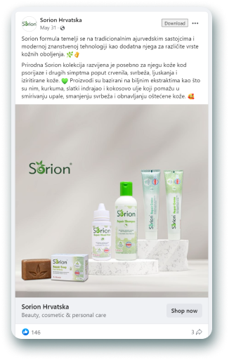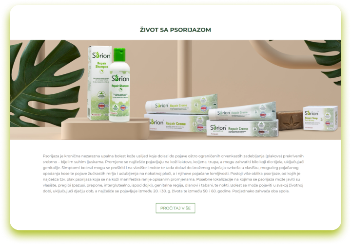 Sorion je na prvom organskom položaju google tražilice za najrelevantiji nišni pojam – krema za psorijazu. Vidljivost koja se time generira pred ciljnom skupinom od izuzetne je vrijednosti u akviziciji novih kupaca, poticanju usmene predaje te pozicioniranju brenda kao sinonima za predmetni pojam.